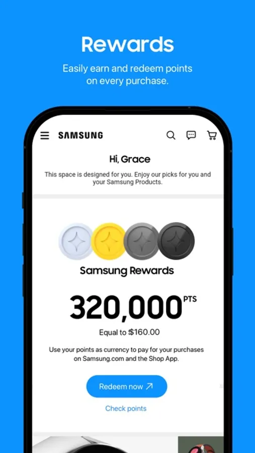 Log in with your Samsung account and earn up to 1.5% reward points with the purchase of select products. Check and redeem your Samsung Rewards points with one click.