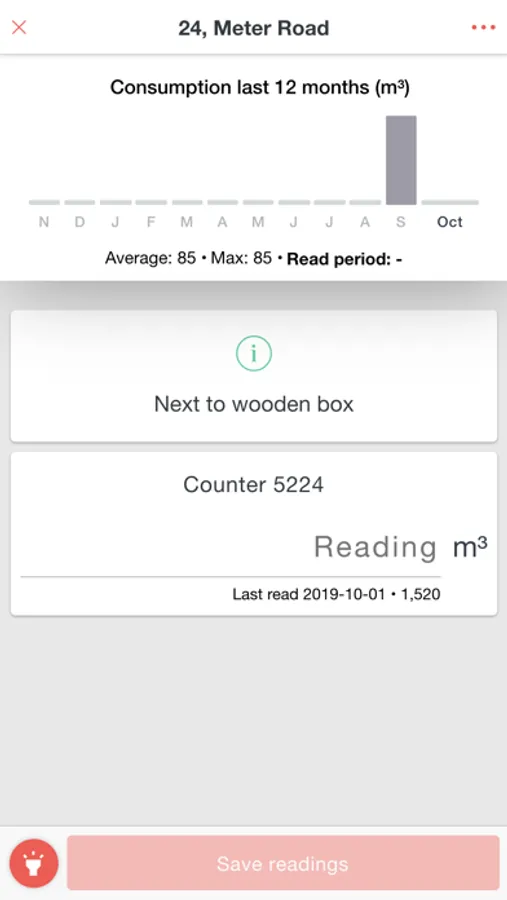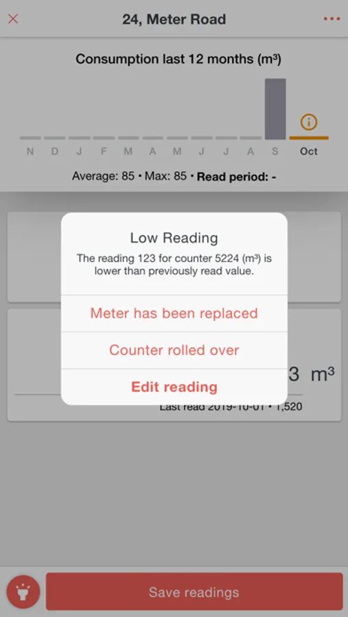 The meter's previous consumption is shown in a chart as the reading is done, so it's easy to verify the correctness of the reading. The app shows a warning for incorrect readings and suggests actions to correct it.