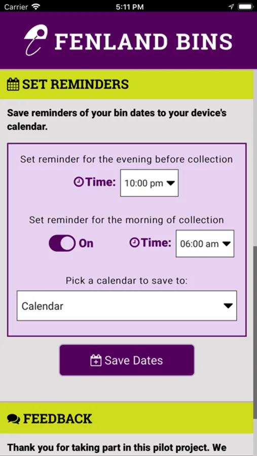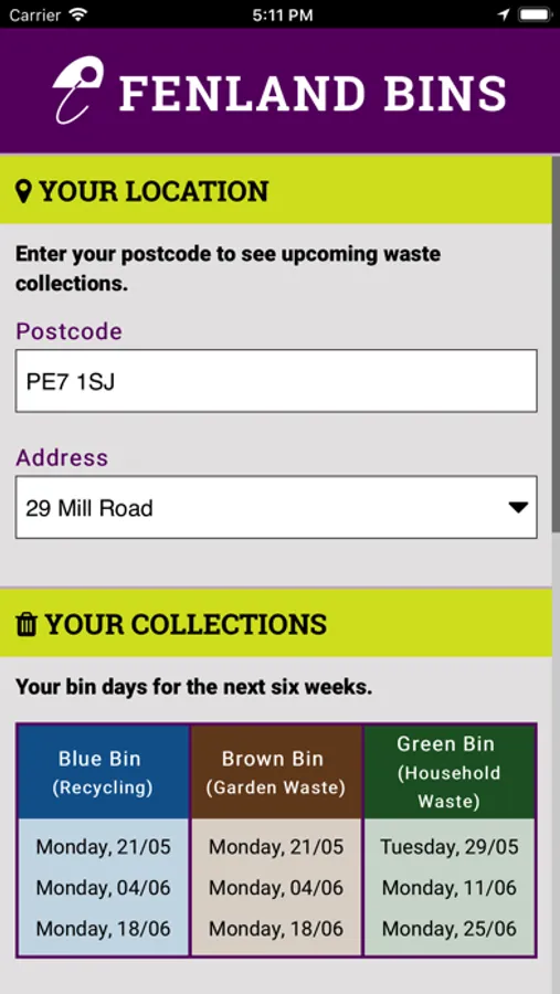 The Fenland Bins app allows you to obtain bin collection information in Fenland, Cambridgeshire. Input your address to see your blue, brown and green bin collection dates for the next six weeks. Also save the dates to your device's calendar and specify when you are reminded of upcoming collections.