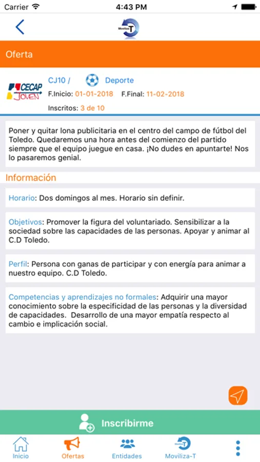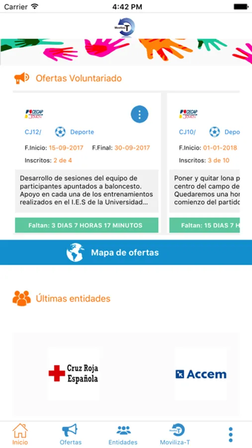 A través de ella, podrás visualizar todas las ofertas activas mediante la definición de las características de las acciones de voluntariado que se ofrece (descripción, objetivos, nº de voluntarios solicitados, horario, aprendizajes no formales que se derivan de la acción de voluntariado...).