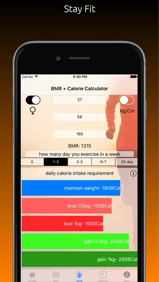We help you to Stay Fit. Did you exercise toady then just it in Stay Fit, we will save it and show report based on it. You can easily find-out how better you exercise. We added BMI(Body Mass Index) calculator & BMR(Basal Metabolic Rate) calculator with Calorie calculator for you. BMI calculator help you to maintain healthy weight. BMR calculator with Calorie calculator help you to maintain, gain or lose your weight.