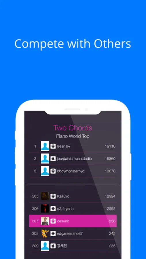 Quickly determine what chord is being displayed on-screen and select it from two options. The quicker the selection, the higher you’ll place on the World Chart.