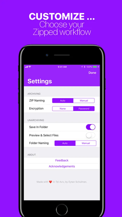 • Customizable Settings — Choose whether you would like to manually name ZIP files, or have Zipped automatically generate a name for you! Decide if you would like to unzip your ZIP file into a folder, or output simply the files themselves!