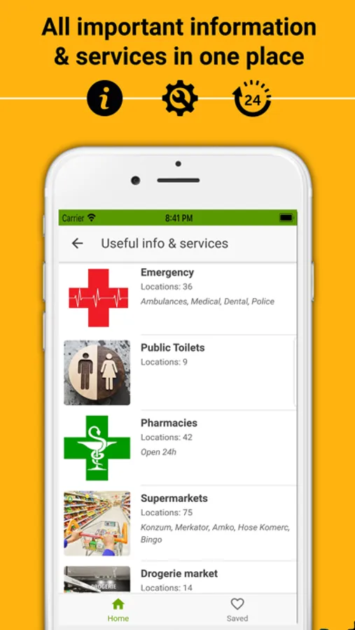- Lots more useful visitor information and services such as locations of exchange offices, ATMs, local supermarkets, 24h pharmacies, doctors, transport, etc.