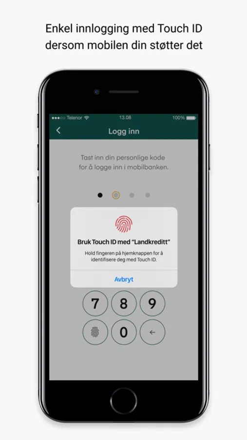 Når du aktiverer mobilbanken må du lage en personlig firesifret kode. Hvis telefonen din støtter lesing av fingeravtrykk eller ansikts-gjenkjenning, kan du velge det til innlogging og betaling.