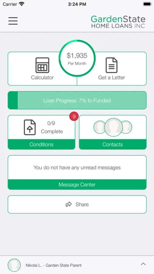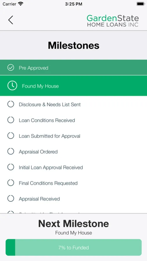 The GardenState Home Loans app allows all 3 parties (home buyer, loan officer, real estate agent) to track the progress of the home loan application process as the Home Buyer meets the milestones and conditions required to get final approval.