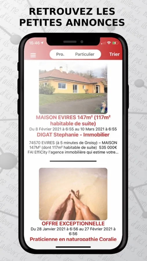 Découvrez depuis l’application les petites annonces que nos adhérents professionnel ou particulier publient sur notre site internet.