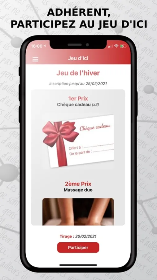 Exclusif à l’application mobile, le jeu d’ici permet aux adhérents du réseau de « j’aime les gens d’ici » de participer gratuitement à un tirage au sort afin de gagner des cadeaux offerts par nos partenaires professionnels. Il suffit d’avoir un abonnement valide à « j’aime les gens d’ici » et d’inscrire votre numéro de badge pour le tirage qui vous intéresse, afin de tenter de remporter l’un des lots mis en jeu.