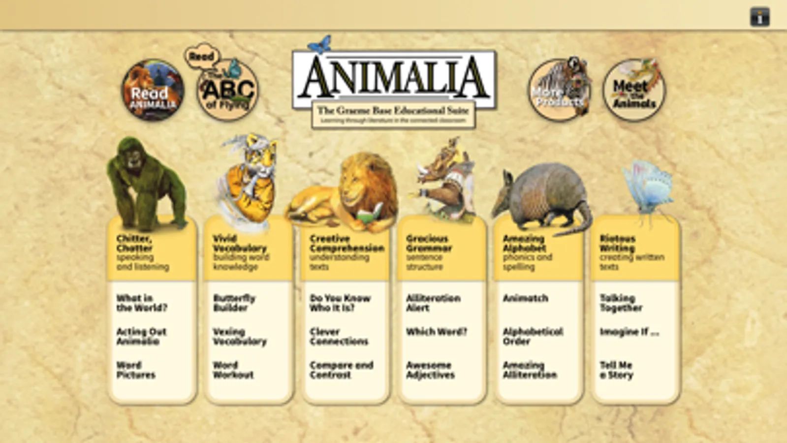 In this app, the characters of Animalia come to life, introducing activities and responding to students as they play the games and complete the activities.