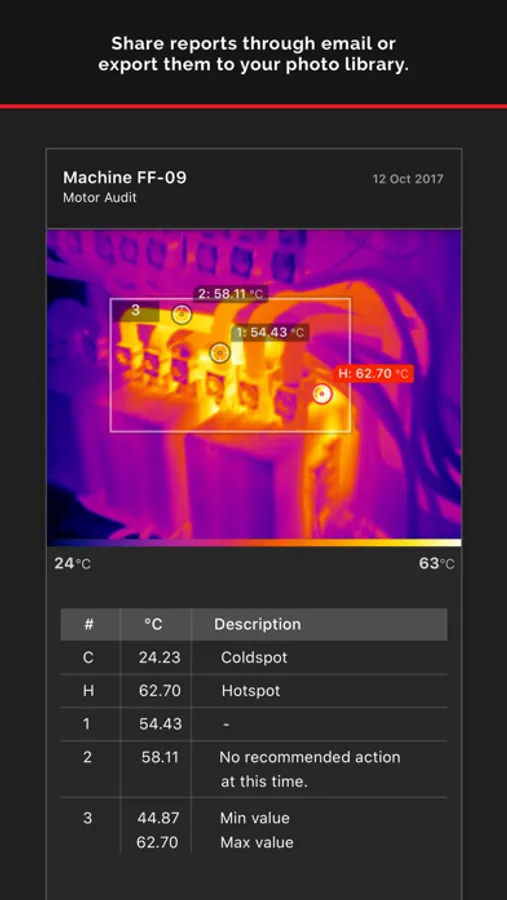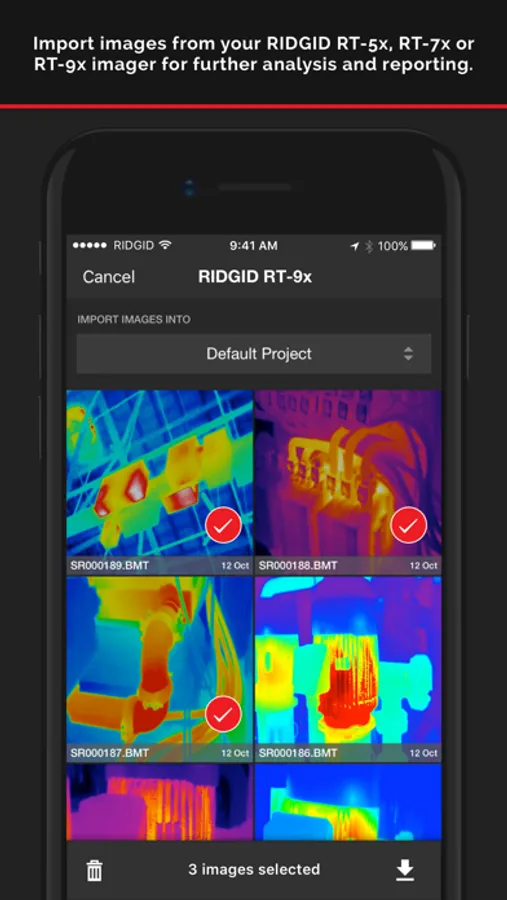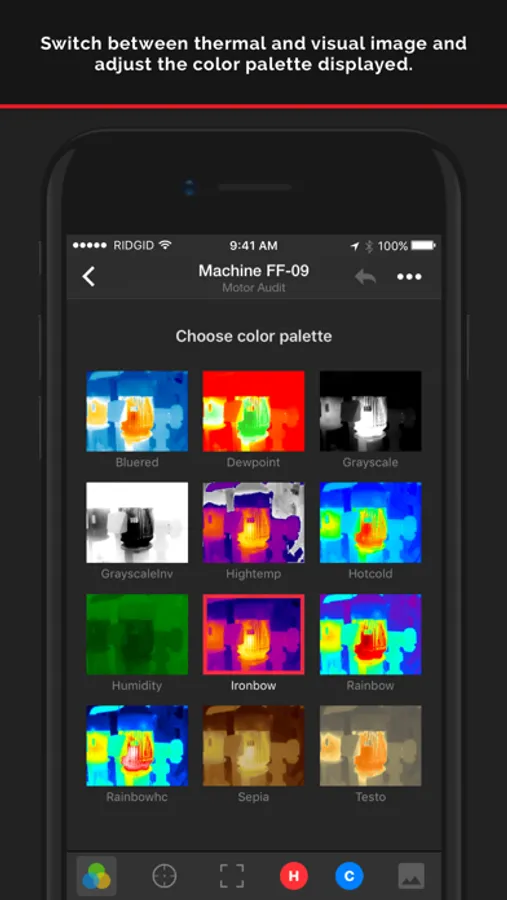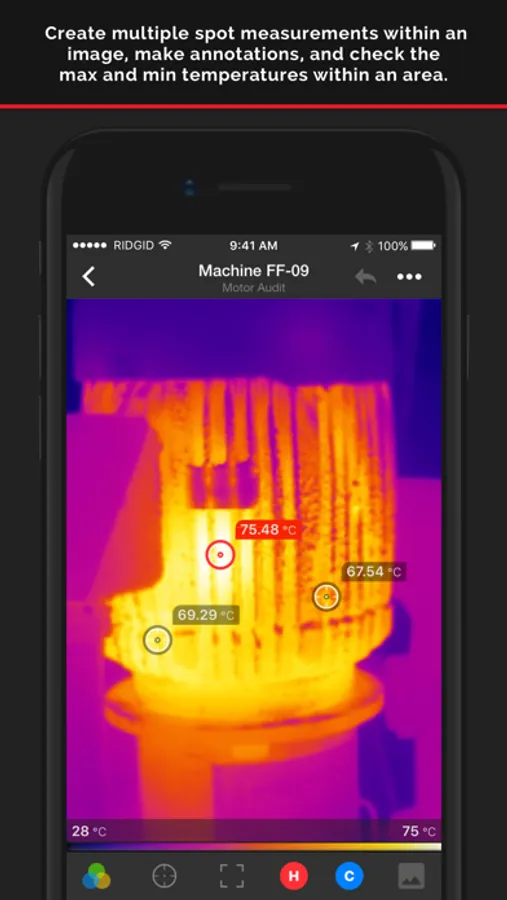 RIDGID Thermal works exclusively with RT-5x, RT-7x and RT-9x Wi-Fi enabled thermal imagers from RIDGID. The app allows seamless transfer of thermal images from the imager to your smartphone or tablet for analysis, organization and sharing. Create multiple spot measurements within an image, easily make annotations, and show the max and min temperatures within an area. It’s easy to navigate between the visual image and the thermal image and well adjust the thermal color palette displayed. Save images and analysis to your photo library and quickly share with others.