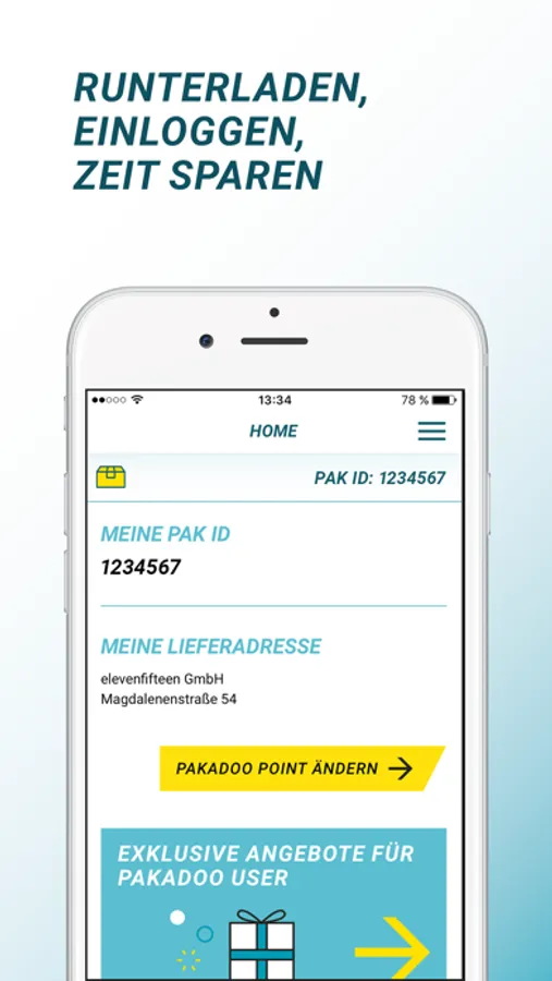 Die myPAKADOO App informiert Sie umgehend über die Zustellung Ihres Pakets am pakadoo point. Den Abholcode bekommen Sie direkt aufs Handy. Mit Push-Benachrichtigungen werden Sie über den Abholstatus auf dem Laufenden gehalten. In der App haben Sie jederzeit einen Überblick über Ihre empfangenen und retournierten Pakete. Und Sie können überall auf Ihre Abholcodes zugreifen. In Ihrem persönlichen Account können Sie Ihre Nutzerdaten ganz einfach verwalten.