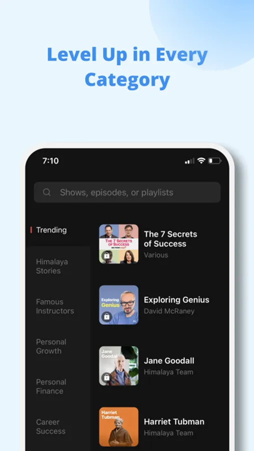 Himalaya gives you the opportunity for a true self-improvement journey. Our stories will inspire and motivate you, while our courses will give you the skills and knowledge you need to set and achieve your most ambitious goals. Audio makes it easy to listen, and become part of a like-minded community making progress every day.
