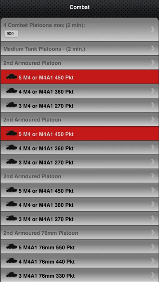Just choose your platoons in the configurator tool and build up your company list. Configurate a complete US Tank Company with all needed elements (HQ, Combat Platoons, Weapons Platoons and Support Platoons) and see the total score of points in any change and combination, no limitation in points. Store your current battle list, use it during the game and even mail it to your mail account or to your friends or your GM.