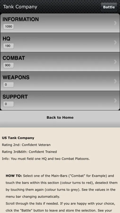 Configurate a complete US Tank Company with all needed elements (HQ, Combat Platoons, Weapons Platoons and Support Platoons) and see the total score of points in any change and combination, no limitation in points. List, view and store your company within the Battle-Screen for an upcoming tabletop battle with your friends.