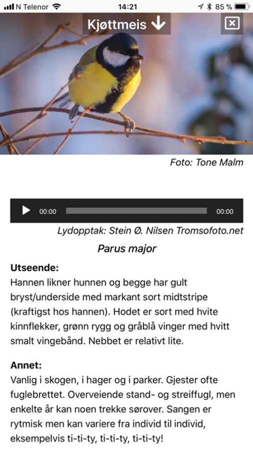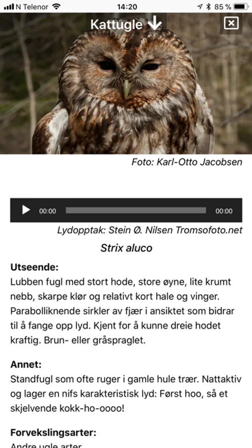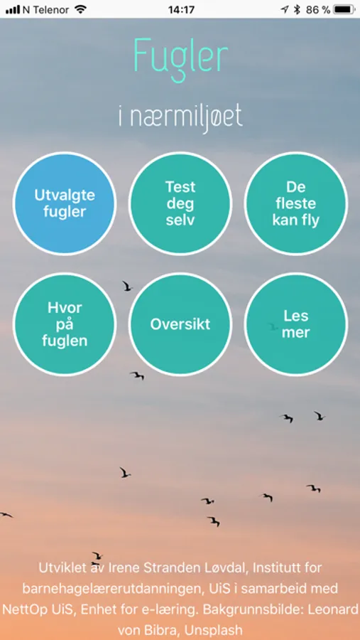 Appen «Fugler i nærmiljøet» er laget for studenter tilknyttet barnehagelærerutdanningen ved Universitetet i Stavanger, men kan også være nyttig for andre som ønsker å lære mer om fugler. Appen tar for seg et utvalg av de vanligste fuglene i norsk natur. Fuglenes utseende beskrives og vises med bilde og et eksempel på fuglens lyd er inkludert. Hensikten er å gjøre brukeren bedre i stand til å gjenkjenne noen av de vanligste fuglene vi har i Norge. Appen inneholder også to quizer for å teste og trene opp egen artskunnskap. Videre inneholder appen to plansjer. «De fleste kan fly» tar for seg karakteristiske tilpasninger i fuglers anatomi og fysiologi som gjør dem tilpasset til å kunne fly. «Hvor på fuglen» tar for seg navnsetting av de ulike delene av fuglen. Bakgrunnslitteratur er oppgitt under «Les mer».