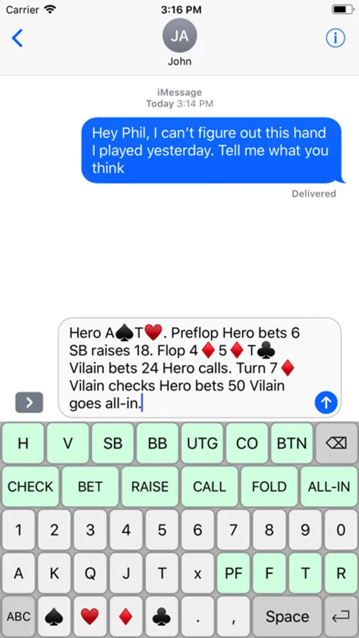 Quickly write your poker hand history in any app: Messages, Mail, Instagram, or whatever!