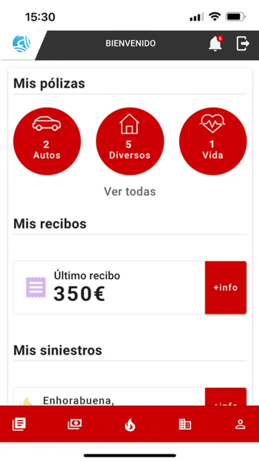 - Acceder a toda la información de tus pólizas, recibos y siniestros. Pudiendo consultar fechas de vencimiento, el estado de tus recibos, la documentación de tus pólizas, el estado de tus siniestros...
