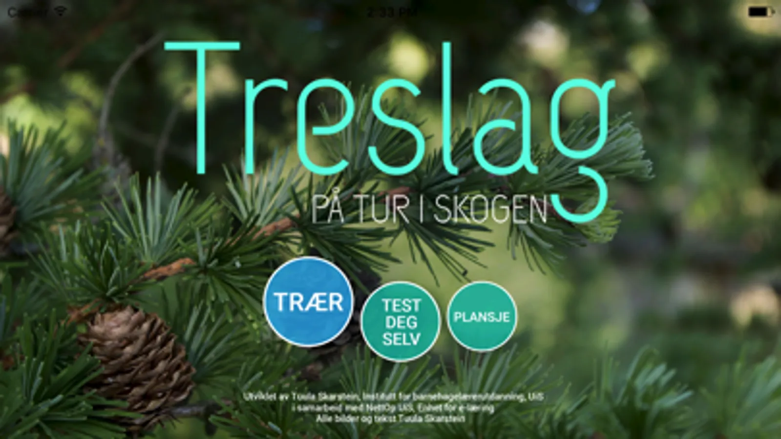 «Treslag-appen» er en enkel og grei måte å lære seg de vanligste trær i norsk natur. Appen hjelper deg til å gjenkjenne de vanligste trærne man finner på tur i skog og park. Appen inneholder også en quiz som kan brukes til å teste din artskunnskap. Appen er laget for barnehagelærerstudenter ved Universitetet i Stavanger, men er nyttig for både barn og voksne som ønsker å lære mer om trær.