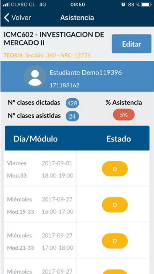 · La aplicación permite al profesor marcar a los estudiantes, presentes, ausentes y atrasados. Permite ver y editar información de asistencia histórica de los estudiantes en cada una de las secciones asignadas.