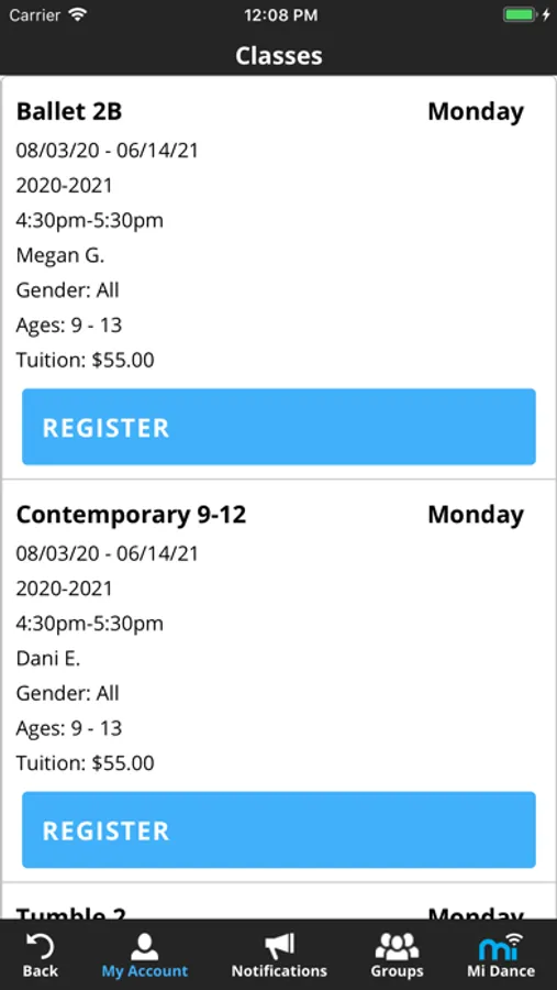 The Mi Dance app allows you to search for your local dance studio and launch their app! Get access to your studio’s group messages, class registration, calendars, team updates, social media, contact information, and much more.