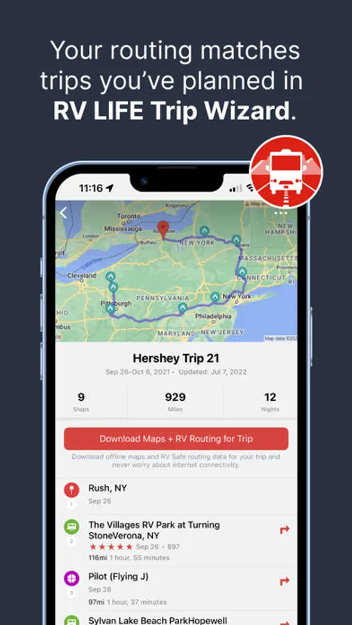 RV Trip Wizard Integration - You can access your planned trips & use our RV GPS to navigate safely to your next destination.