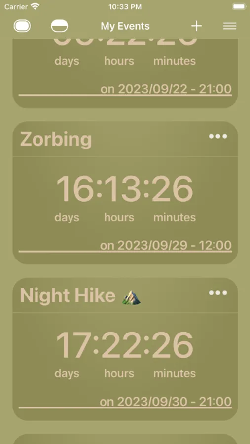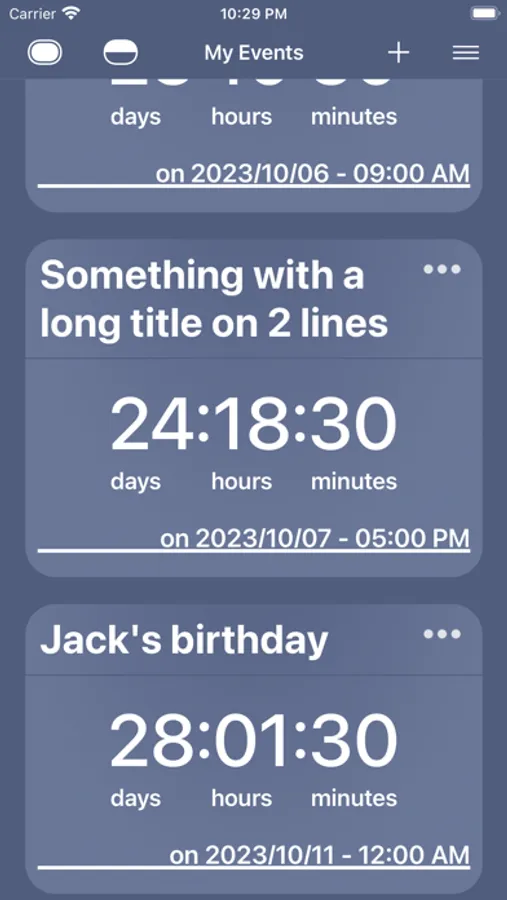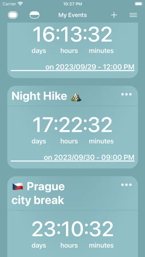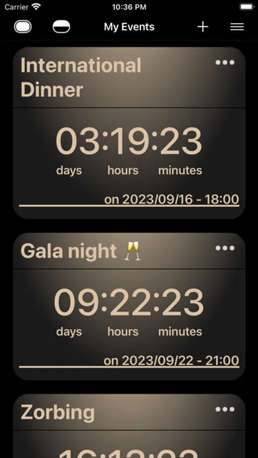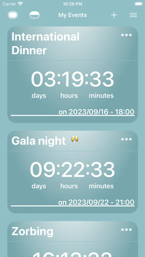 You can create a card for any of your future events and always know the exact number of days, hours and minutes until that specific event. You will also receive a notification for each event.