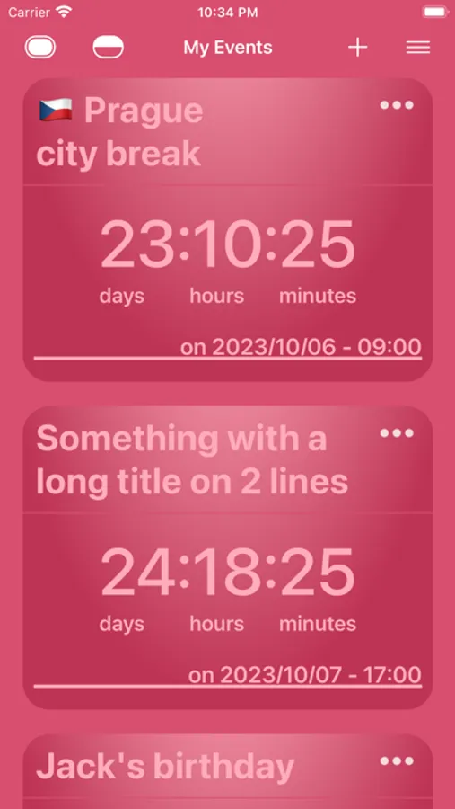 You can set a countdown to birthday, exam, vacation, holiday, sports events, wedding, anniversary... anything! Just tap the +, add a title, pick the date for the event and one for the notification and hit save.