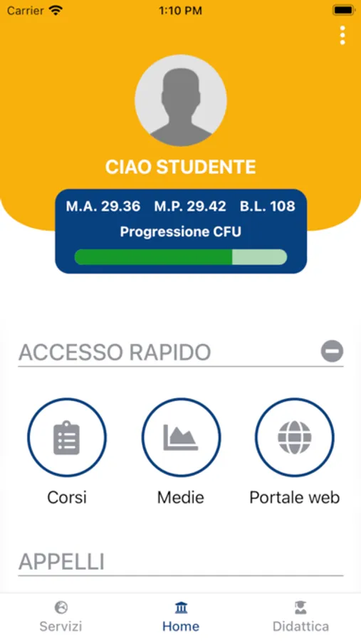- Appelli: visualizza gli appelli disponibili, se l'icona è verde puoi prenotarti immediatamente per l'appello. Puoi anche visualizzare il numero di studenti già prenotati.