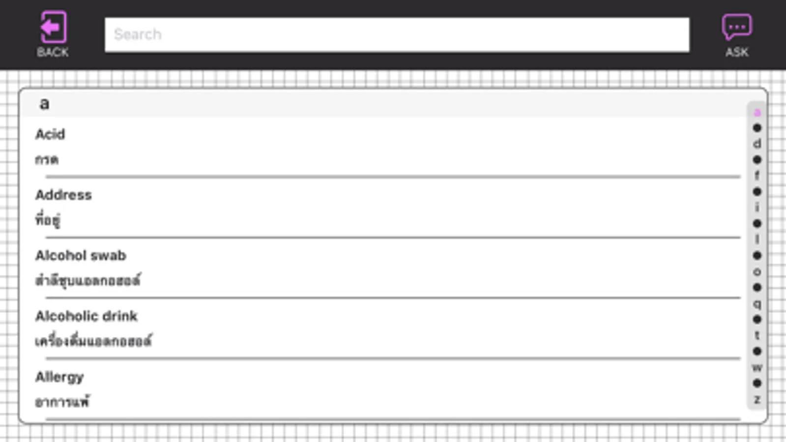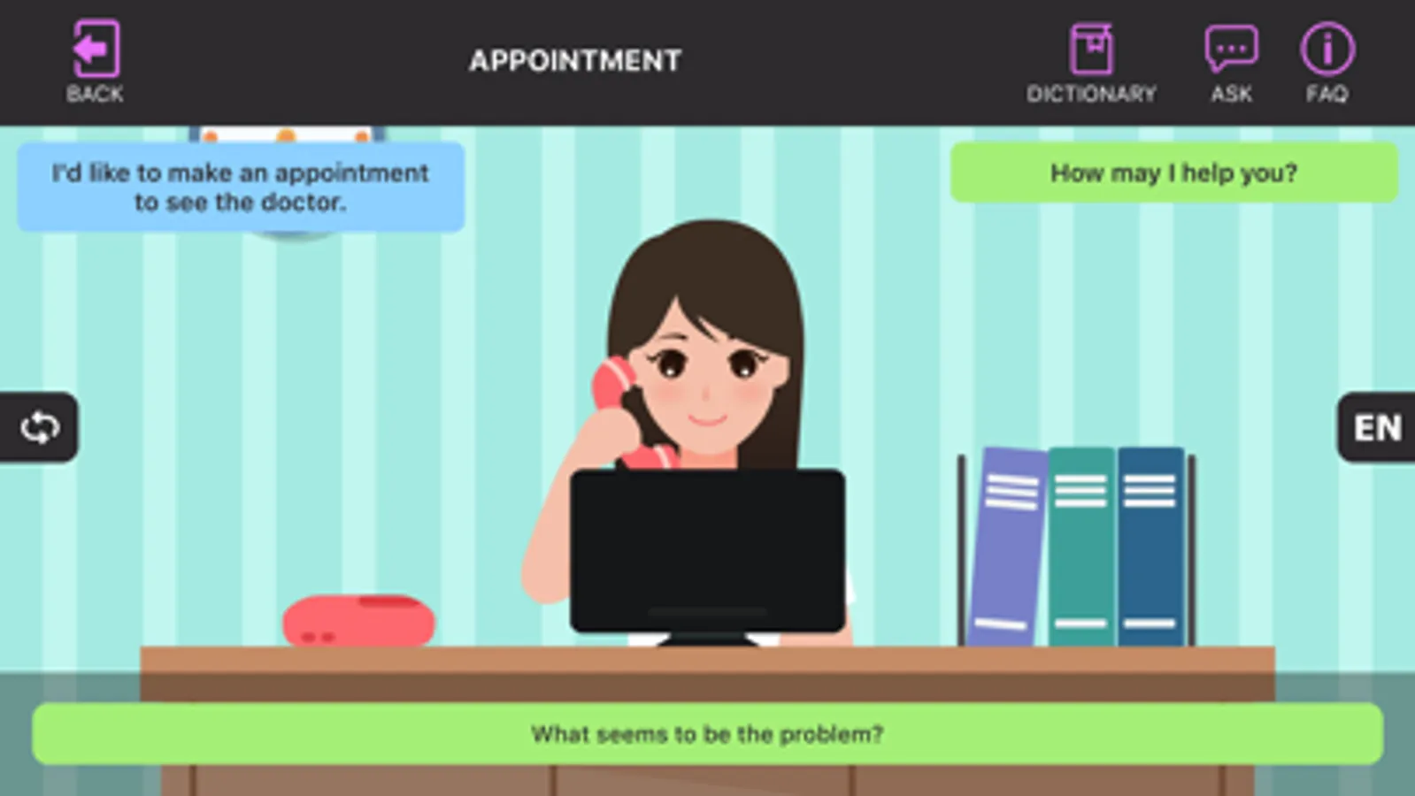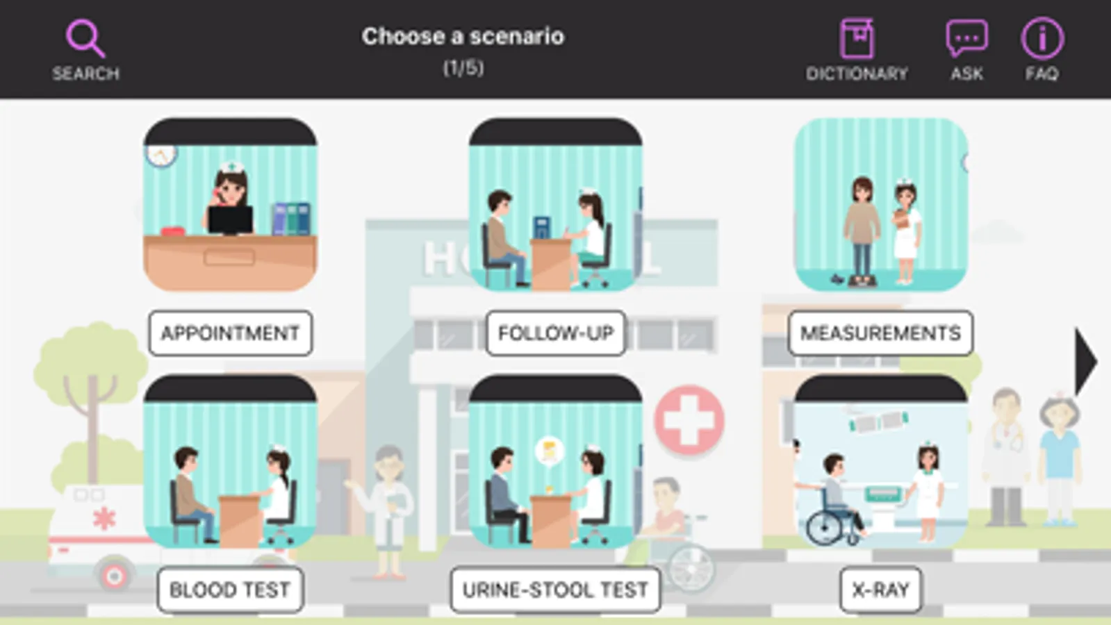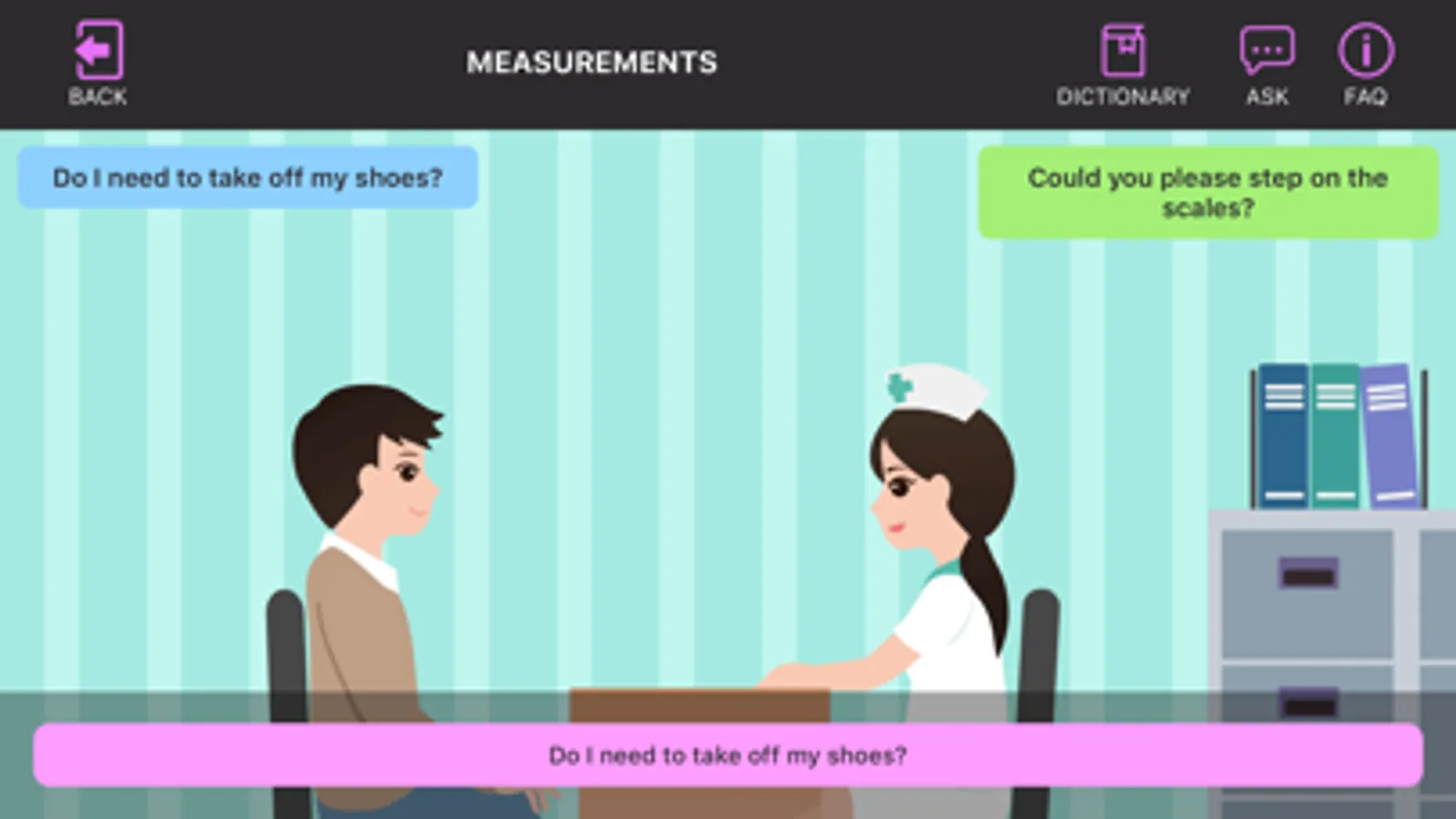 This application is designed for use by public health staff/workers as conversation practice with foreign patients. The dialogues simulate real situations that occur frequently at hospitals and other health facilities. Each conversation provides for a range of responses to create the feel of a role play game. To promote continuous learning, these dialogues are accompanied by translation, vocabulary lists and supplementary self-practice exercises. Users can post questions, and answers will be provided and stored in a database made accessible to the public.