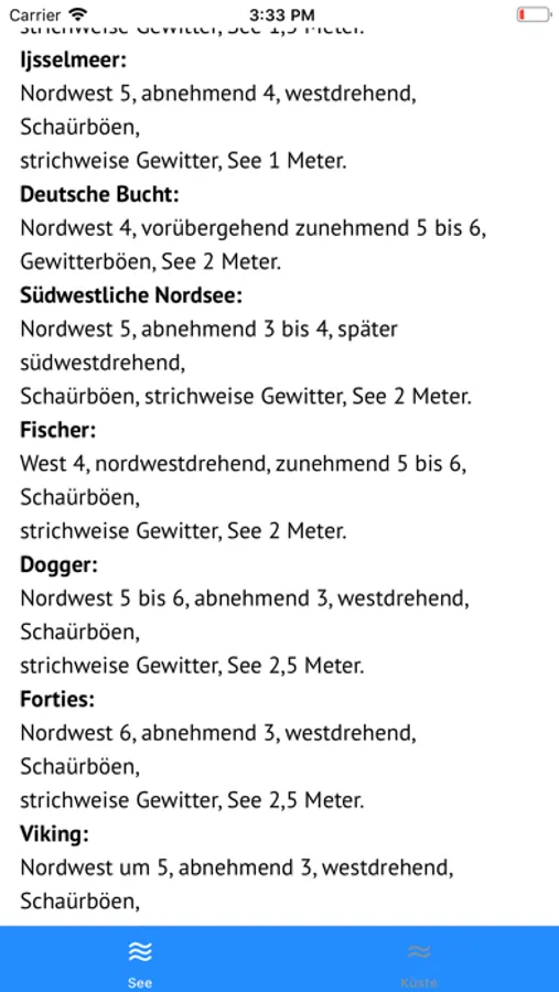 In der App findest du neben dem See- und Küstenwetterbericht eine Vorhersage für die kommenden 30 Stunden sowie einen Trend für die kommenden 2 Tage. Der Seewetterbericht gilt immer für die nächsten 12 Stunden, der Küstenwetterbericht für die nächsten 18 Stunden.