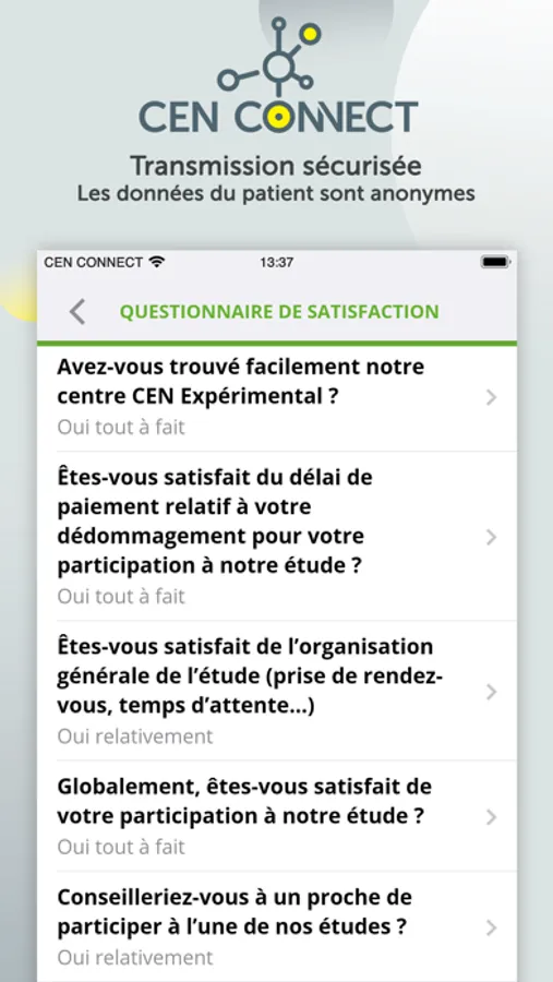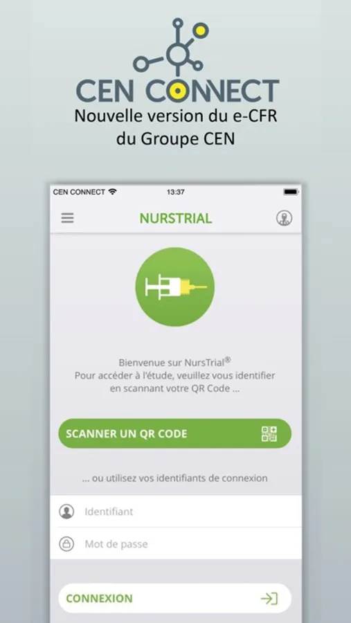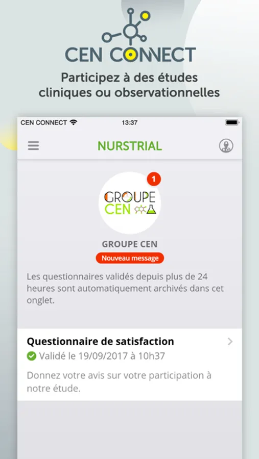 NursTrial® est une application sécurisée de recueil de données sur smartphone. Dans le cadre des études mises en œuvre par CEN, cette application vise à permettre à des utilisateurs, préalablement autorisés (disposant d’un identifiant et d’un mot de passe), de répondre à des questionnaires programmés au regard des protocoles d’évaluation validés. Les données saisies sont transmises de manière pseudonymisée et chiffrée.