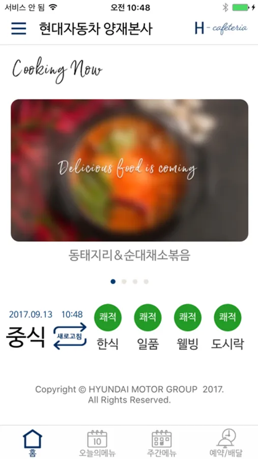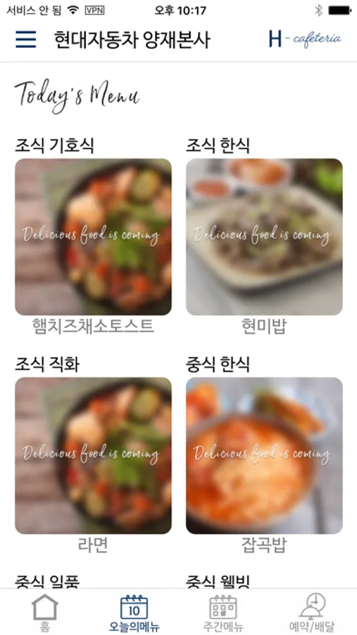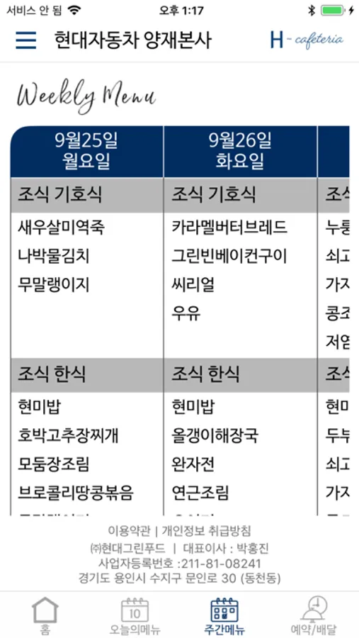 현대그린푸드 급식서비스를 이용하는 고객을 위한 앱(H-cafeteria) 입니다.