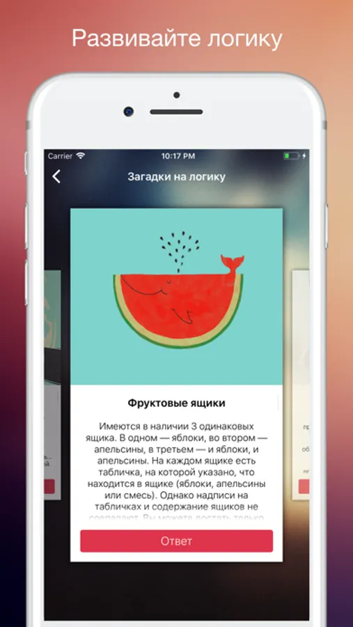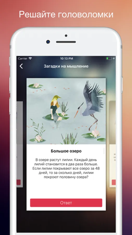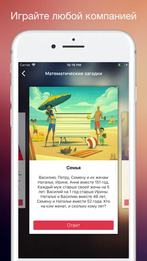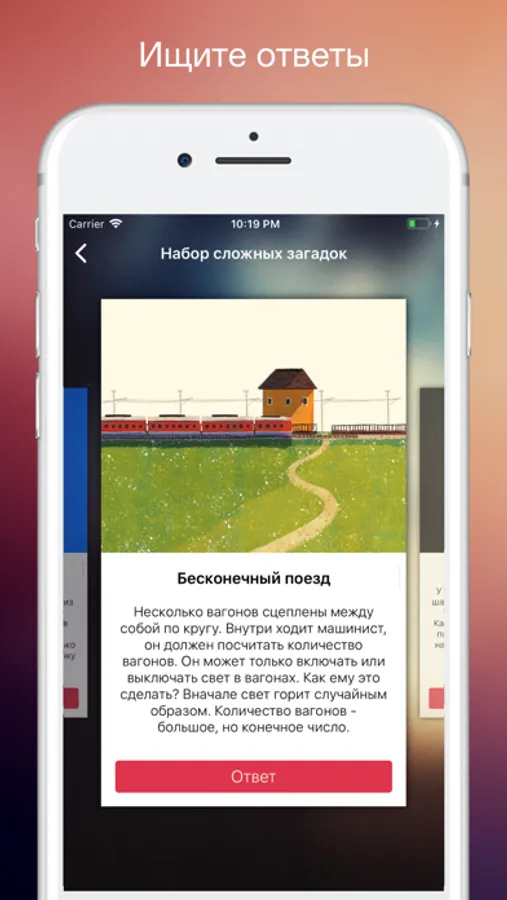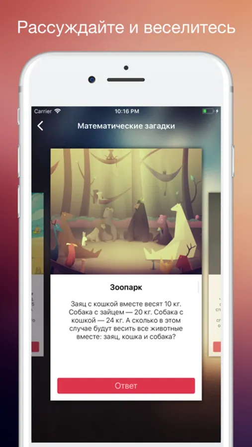 Загадки - это веселый способ провести время в любой компании. Отгадывайте логические головоломки, решайте математические задачи, раскусывайте сложные загадки. Разгадывайте загадки с друзьями, в дороге, на вечеринке, в кафе, и на улице.