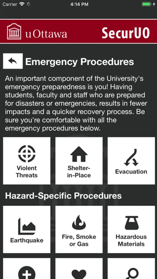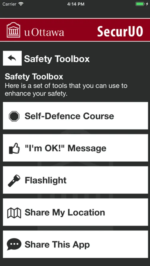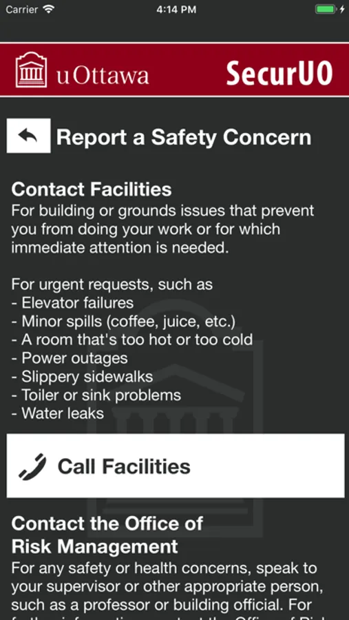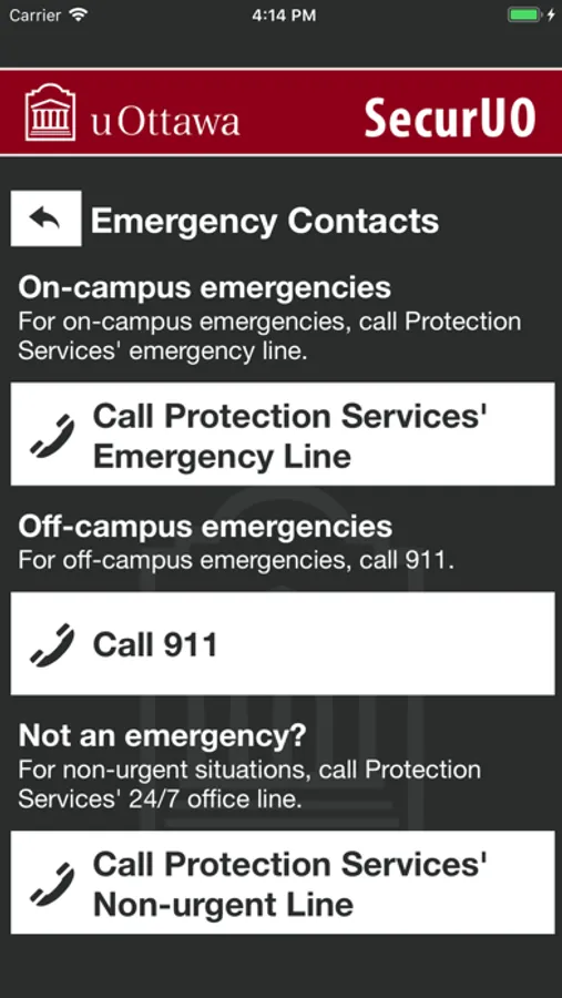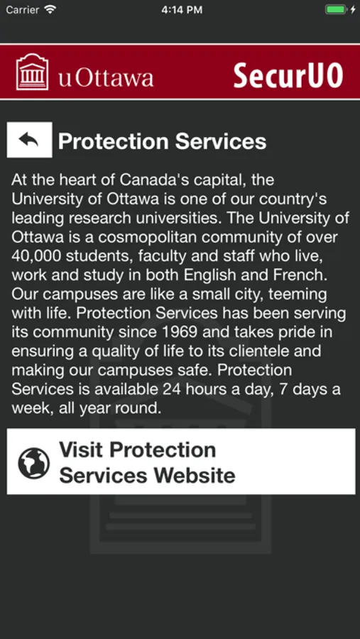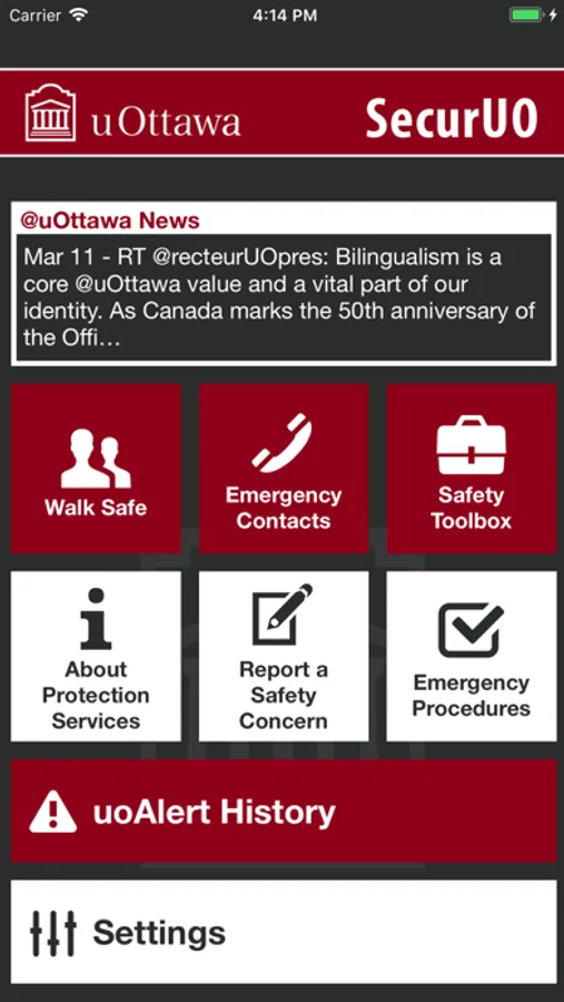 With SecurUO, be quickly alerted to emergency situations at the University of Ottawa or reach out directly to uOttawa’s Protection Services when you need help. Additional features include easy access to safety resources, emergency procedures, a safety toolbox, and more.