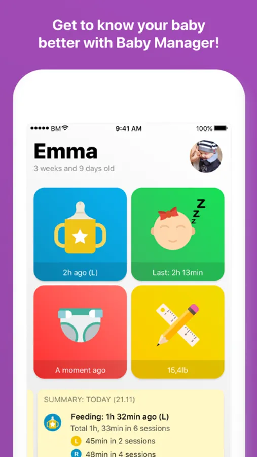 Simple and intuitive. Baby Manager will give you peace of mind by keeping track of your little one and give you timely reminders for the sleep-deprived parent that you are.