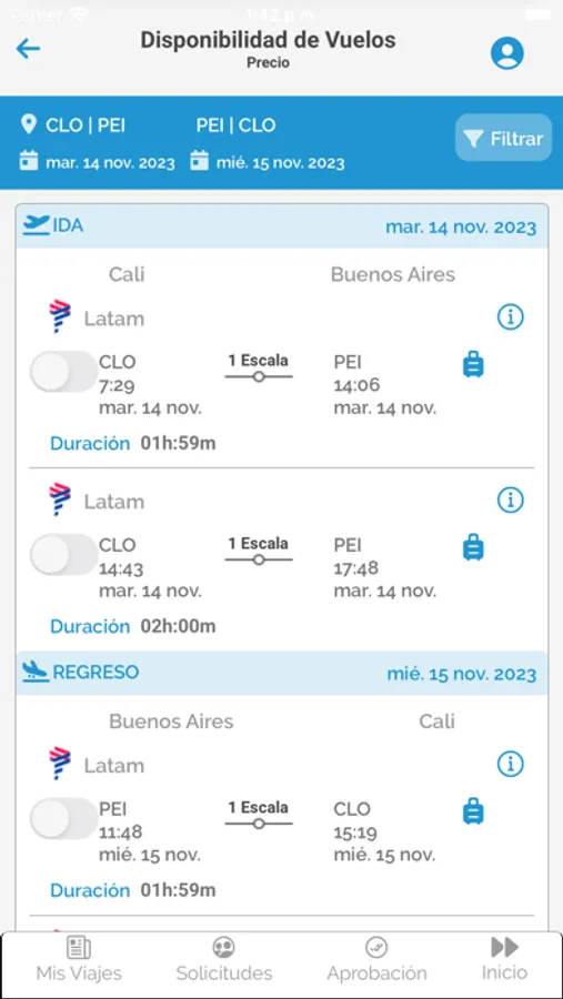 Consulta: Permite hacer búsqueda de vuelos acorde a las políticas de viaje de la compañía.