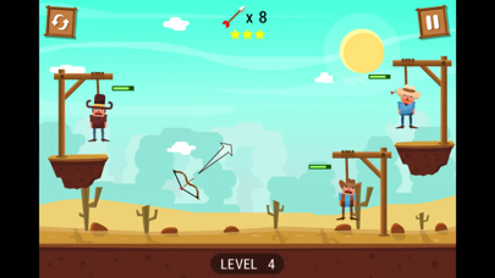 牛仔们被悬挂在木棍上命悬一线,现在就让我们一起来解救他们吧,我们需要控制好弓箭的方向与力度,尽可能精确的射在绳索上,否则可能会对牛仔们造成二次伤害,一起来试试吧!