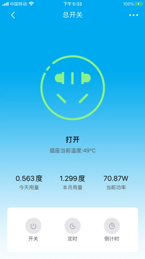 通过手机网络控制插座,实现打开、关闭插座功能,定时功能,倒计时功能。App远程查看开关状态,插座电器耗电情况。