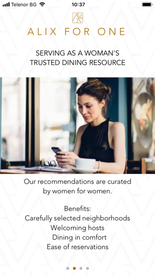 ALIX for ONE is a trustworthy travel companion, created to enrich your experience while traveling for business or leisure. It gives you access to a woman’s inside guide of what to see or do in a city, the chance to meet and network with like-minded women and a resource of the best advice on where to dine in comfort and safety. Whether you’re a Baby Boomer, GenX or Millennial, ALIX for ONE is your key to getting the most out of a city!