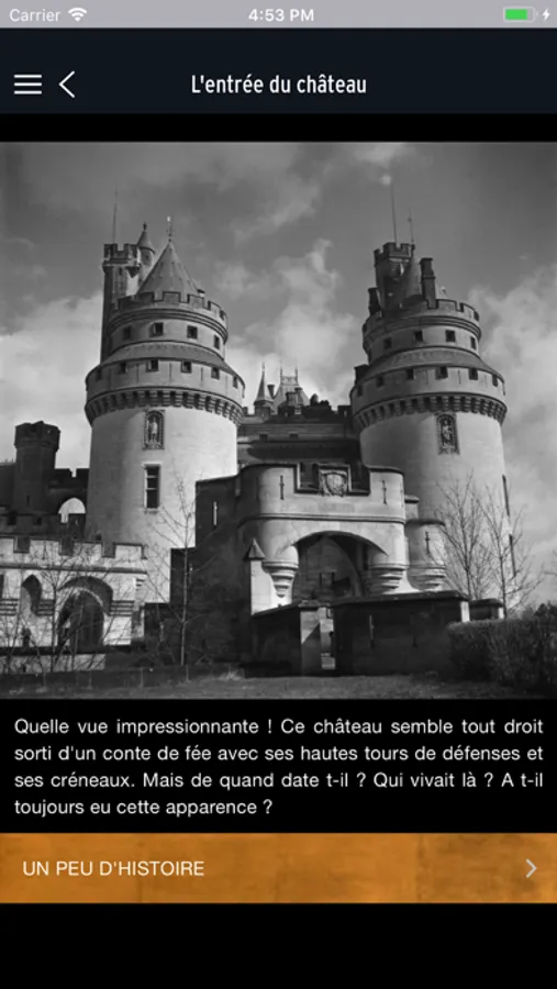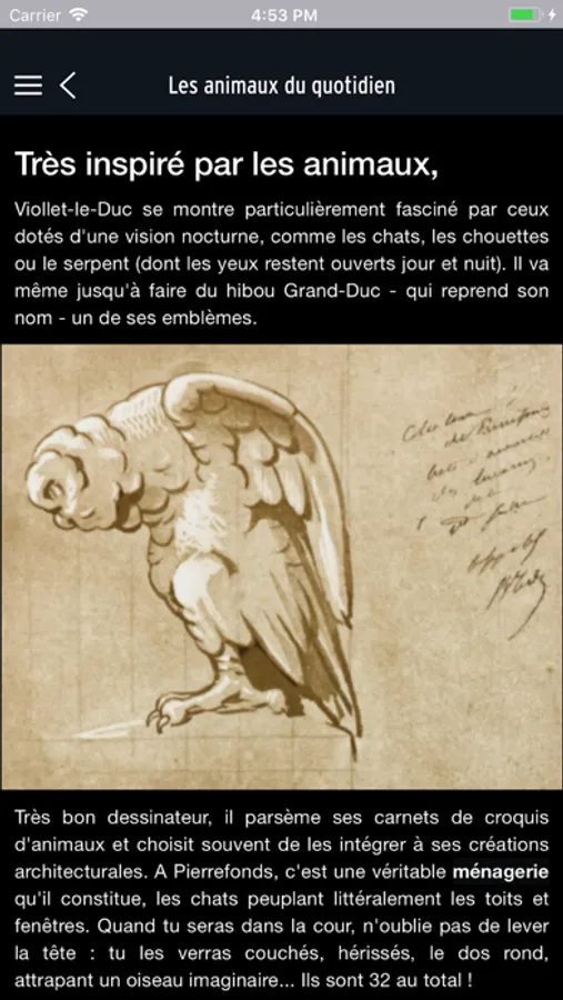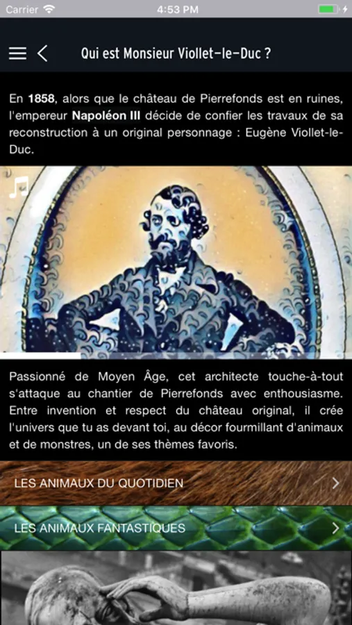 L’application « La Ménagerie fantastique de Monsieur Viollet-le-Duc » est proposée aux visiteurs du château de Pierrefonds et s’adresse en priorité au public jeune et au public famille. Elle permet de découvrir salle par salle l’histoire du château de Pierrefonds, de ses origines médiévales à sa reconstruction au XIXe siècle. Et surtout, elle offre aux utilisateurs la possibilité de partir à la chasse de l’extraordinaire faune dissimulée parmi le décor sculpté, peint ou forgé de l’édifice. Pour ce faire, la rubrique « Sauras-tu retrouver… ? » fera chercher aux visiteurs quelques créatures sélectionnées, au gré des différents espaces traversés. L’application présente également au visiteur la personnalité d’Eugène Viollet-le-Duc, l’architecte ayant reconstruit le château au XIXe siècle et imaginé la majorité des représentations animales du site. Un petit personnage dessiné à son effigie accompagne ainsi le visiteur le long de sa visite, apparaissant sur plusieurs vues. A quatre reprises, l’application a recours à un lecteur de QR code pour des petits bonus audio !
