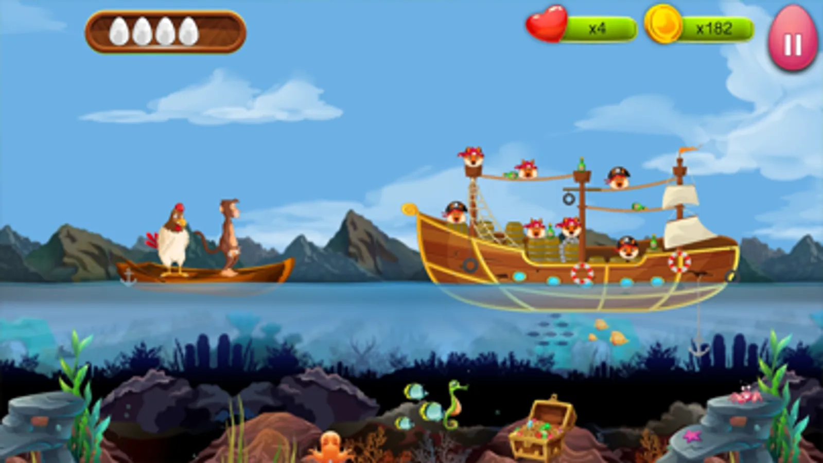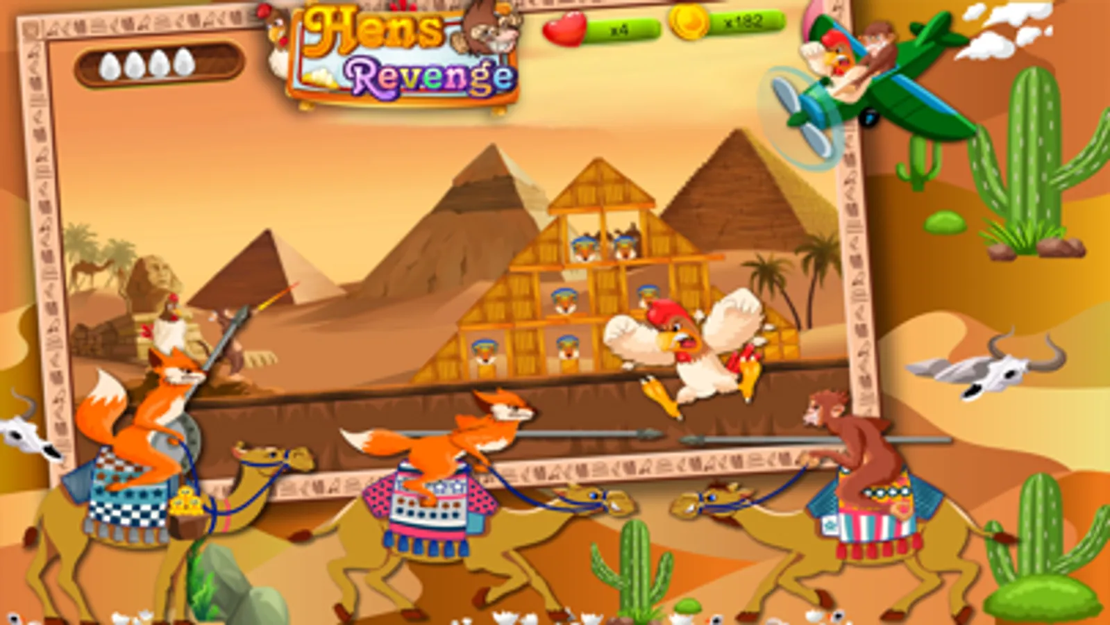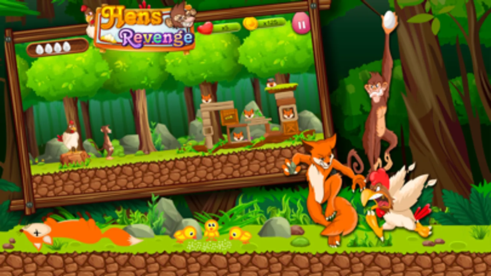 Hen, Chicken, the monkey, and the other birds have to get through the terror of a cunning fox. They become angry as they try to protect their chicks from his evil. To take revenge they will use their eggs to strike back! Unlockables can be used, as well as tactics and brainpower, to defeat the fox and his plans!