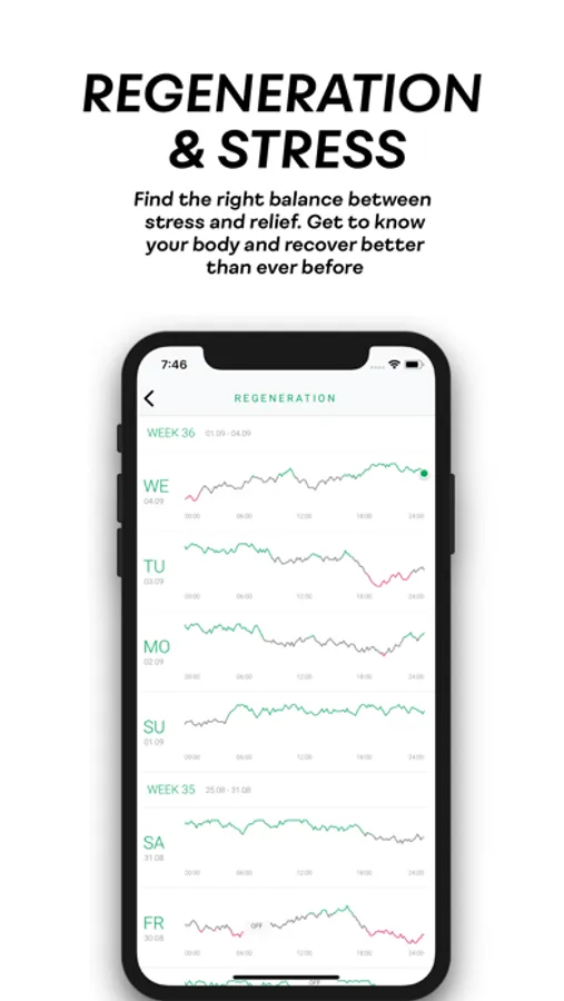 Everything at a glimpse: your steps and burned calories, regeneration and stress, your sleep patterns, your last trainings and your dehydration level.