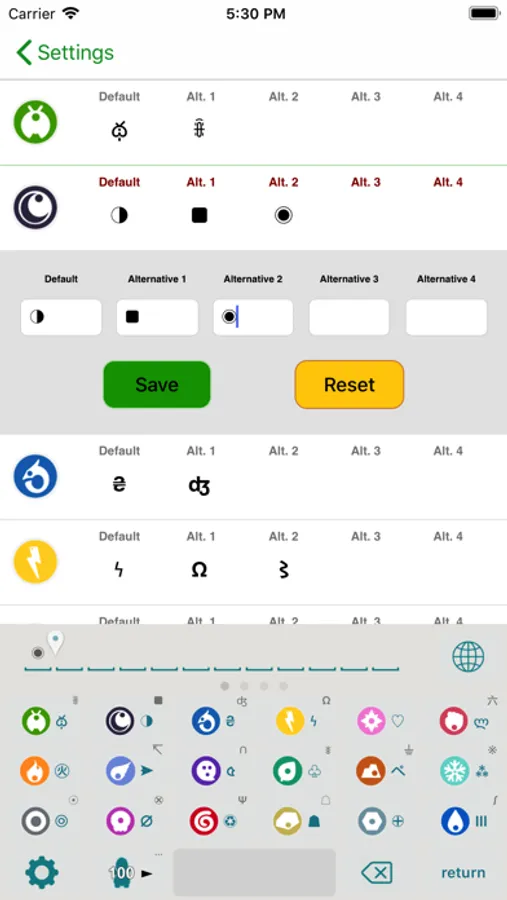 Page 1 - Unicode symbols (customizable by upgrading to Premium) with alternate symbols through a long-press gesture.