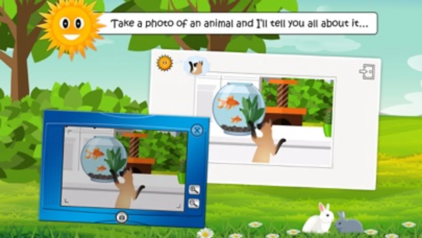 - The child looks for the animals on the scene on the screen. He or she then unlocks an animated card for that animal and can listen to its name in several languages or record his or her voice.