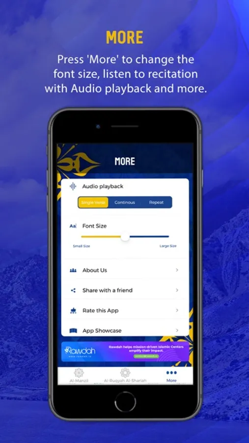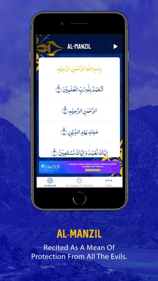 Al-Manzil is an Islamic Smartphone application that brings Muslims all over the world an opportunity to listen to beautiful recitation of Manzil. It provides the usual Islamic conduct that must be practiced by the Muslim community. Reciting Quran verses are source of blessing for the individuals. It strengthens the faith and belief of the worshippers on Allah. For user convenience, the application features two primary sections; Al-Manzil and Al Ruqyah Al Shariah.
