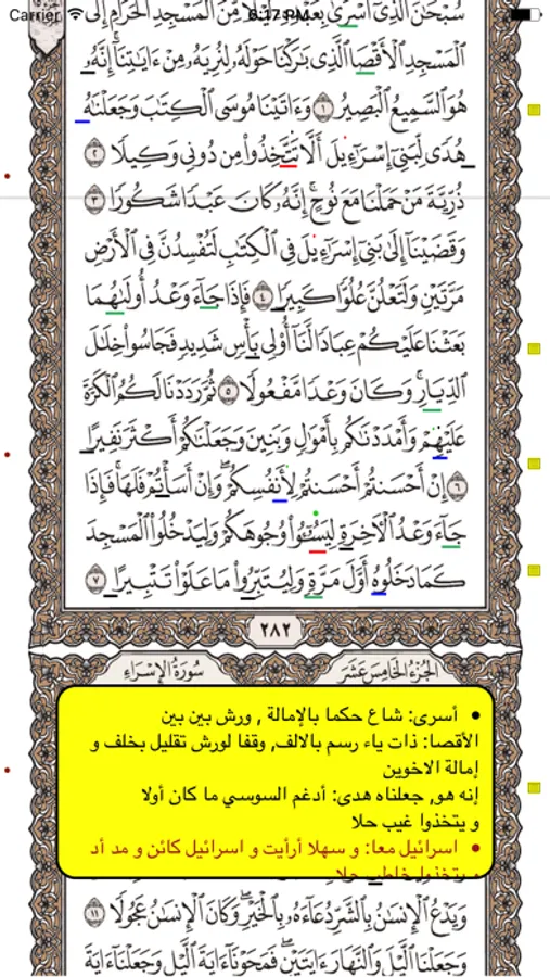 يعرض البرنامج صفحة واحدة من المصحف كاملة و يمكنك الانتقال إلى الصفحة التالية بالتحرك إلى أعلى و العودة تكون بتحريك الشاشة إلى أسفل. كما يمكن التحرك عدة صفحات مرة واحدة بالحركة السريعة في الاتجاه المطلوب. يظهر في الثلث العلوي من الصفحة مساحة محدودة بخط رمادي خفيف تبين الأدلة التي ستعرض في المربع الأصفر في ثلث الصفحة الأخير, الخط الأسود للسبع و يقابل المربعات الصفراء يمين الصفحة, و الخط البني للدرة ويقابل الدوائر البنية يسار الصفحة و الخط الأخضر للارشادات و يقابل النجوم الخضراء يسار الصفحة