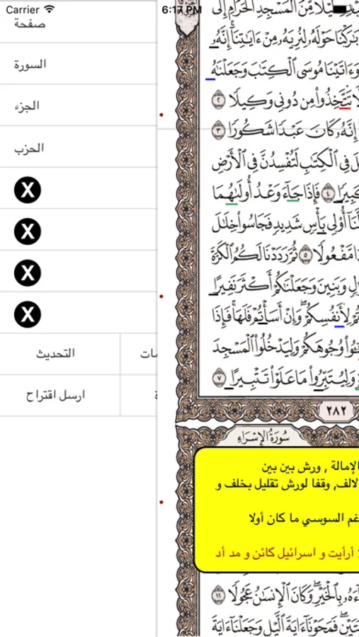 تظهر القائمة بإزاحة الصفحة يمينا و منها يمكن اختيار الصفحة أو السورة أو الجزء أو الحزب المطلوب عرضه . من هذه القائمة أيضا تستطيع التحديث لآخر تصحيحات عند اتصالك بالإنترنت و لا تستغرق كثيرا و يخبرك بعدد الملفات المحدثة ويقوم بتحميلها مباشرة في نفس الصفحة المعروضة وقتيا. كما يمكن لمن أراد التعليق أو الإبلاغ عن شيء إرساله من تلك القائمة. يمكنك اضافة أكثر من موضع للعودة إليه بعد ذلك , و يمكنك تعديله أو حتى مسحه.