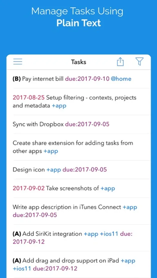 + Your todo.txt file is parsed, optimised and rendered beautifully in a Universal app that works on iPhone as well as iPad.