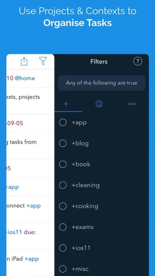 + Filter tasks based on projects, contexts and other metadata. [Pro]