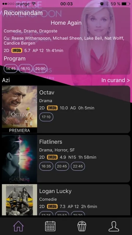 Utilizatorul aplicatie Cinema Palace, poate in pasi foarte scurti si intuitivi, sa-si selecteze filmul dorit, ora de difuzare si locurile in sala de cinematograf pentru a rezerva sau pentru a achizitiona biletele direct de pe telefonul mobil.